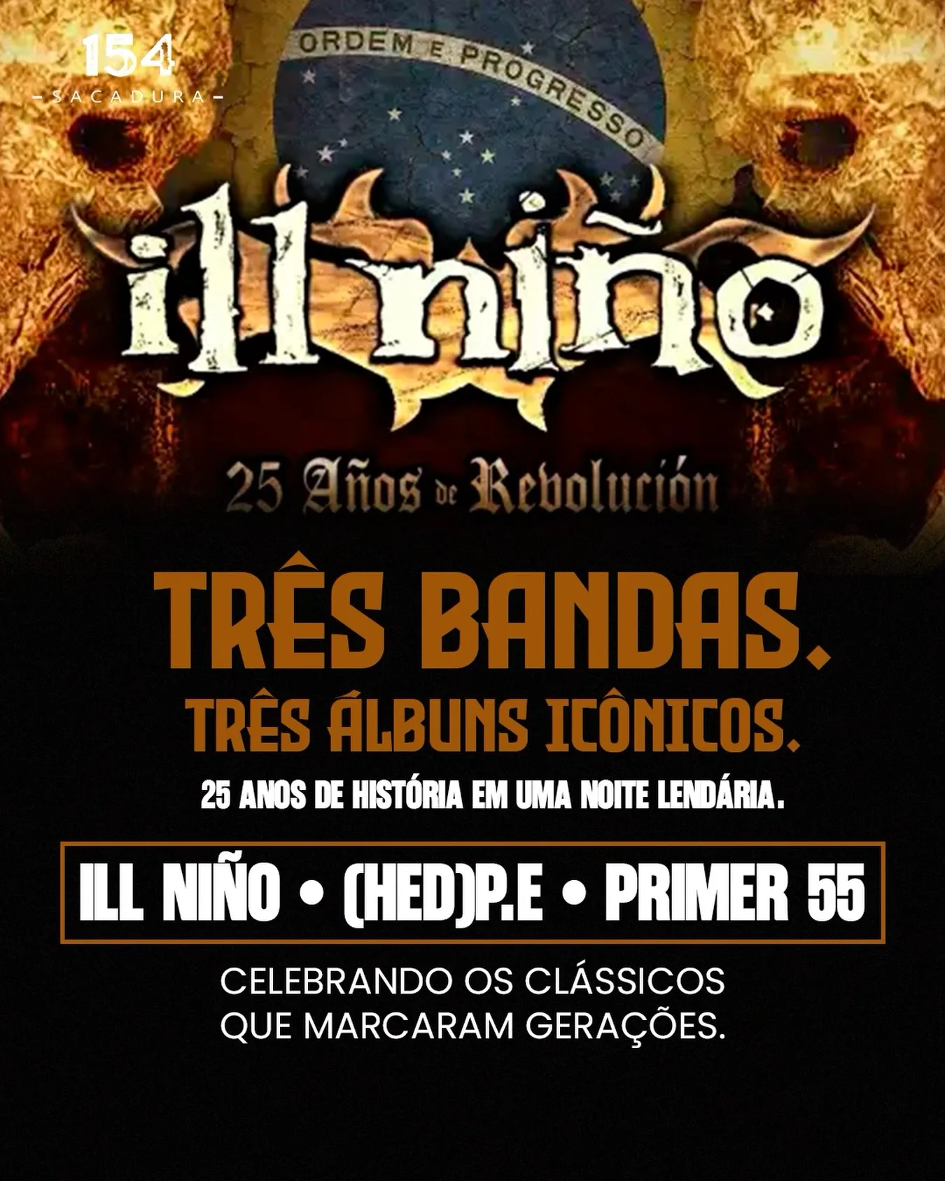 O Ill Niño traz sua fusão única de metal com ritmos latinos, enquanto o Hed P.E. incendeia o palco com seu G-Punk rebelde. Para completar, o Primer 55 retorna com o peso do rapcore. Uma oportunidade única de ver essas potências juntas no mesmo palco!