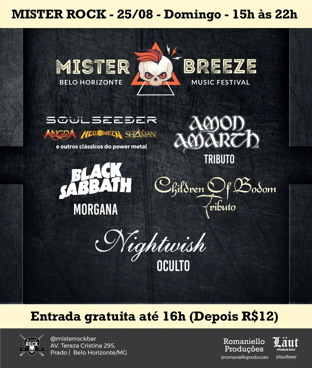Nesse domingo é dia Mister Open Air com as bandas Amon Amarth Tributo, Children of Boom Tributo, Oculto (Nightwish Cover), Morgana (Black Sabbath) e Soul Seeder (Angra, Helloween, Shaman, Stratovarius e clássicos do Power Metal).
