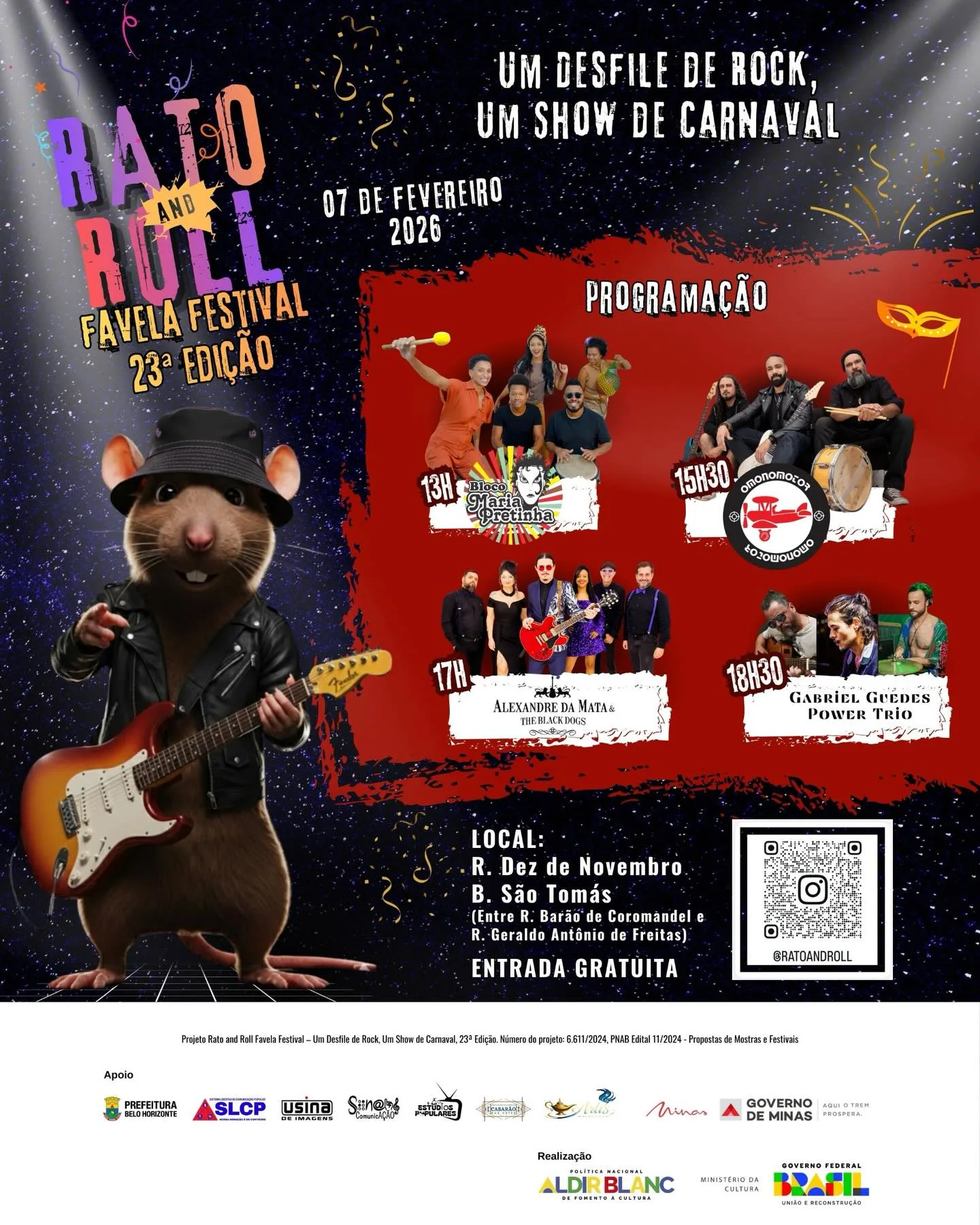 A 23ª edição do Rato and Roll Favela Festival chega com tudo para unir o peso do rock à alegria do carnaval! Realizado na Vila São Tomás, na região Norte de Belo Horizonte, o evento é uma celebração da cultura independente e da ocupação dos espaços públicos.
