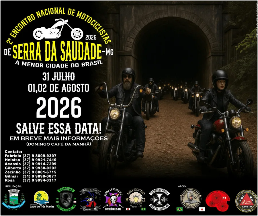 Após o sucesso de 2025, Serra da Saudade/MG se prepara para ser novamente o epicentro do motociclismo nacional. De 31 de julho a 02 de agosto de 2026, a menor cidade do país em população vai ficar gigante em animação, recebendo irmãos de estrada de todo o Brasil para um fim de semana inesquecível.