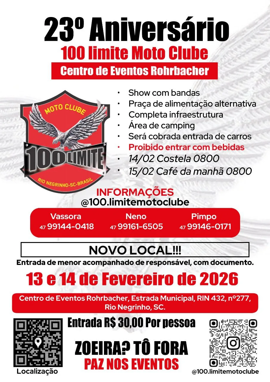 Em fevereiro de 2026, Rio Negrinho/SC será o palco de uma grande comemoração. O 100 Limite Motoclube completa 23 anos de fundação e convida toda a irmandade para festejar essa trajetória de sucesso. De 13 a 15 de fevereiro, prepare-se para ser muito bem recebido no sul do país.