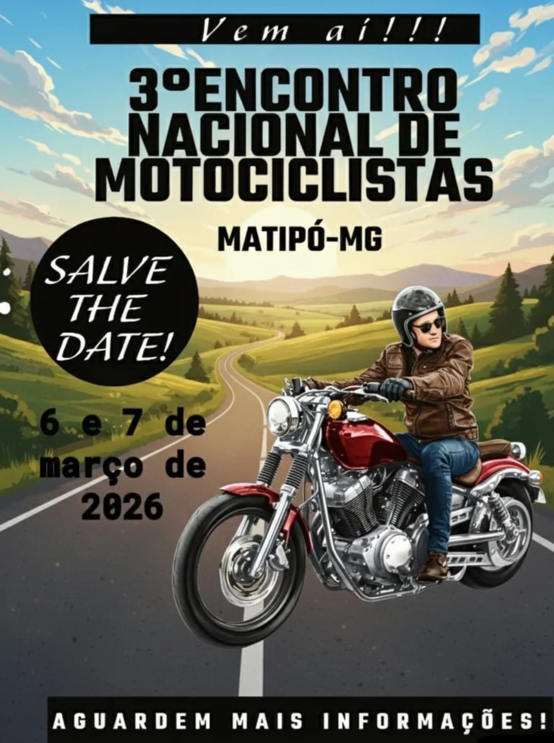 Em março de 2026, a cidade de Matipó/MG será o destino obrigatório para quem ama a estrada. O 3º Encontro Nacional de Motociclistas promete reunir a irmandade em dois dias de muita festa, rock e confraternização. Sob o comando dos motoclubes Feras do Asfalto e Guardiões do Destino, o evento se consolida como um dos grandes destaques da região.