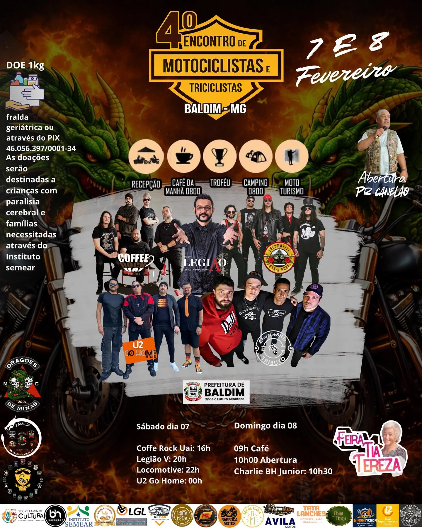 A cidade de Baldim (MG) recebe, nos dias 07 e 08 de fevereiro de 2026, a 4ª edição do seu tradicional Encontro Nacional. Organizado pela Prefeitura de Baldim em parceria com o Dragões de Minas Motoclube, o evento promete um fim de semana inesquecível de rock, estrada e amizade.