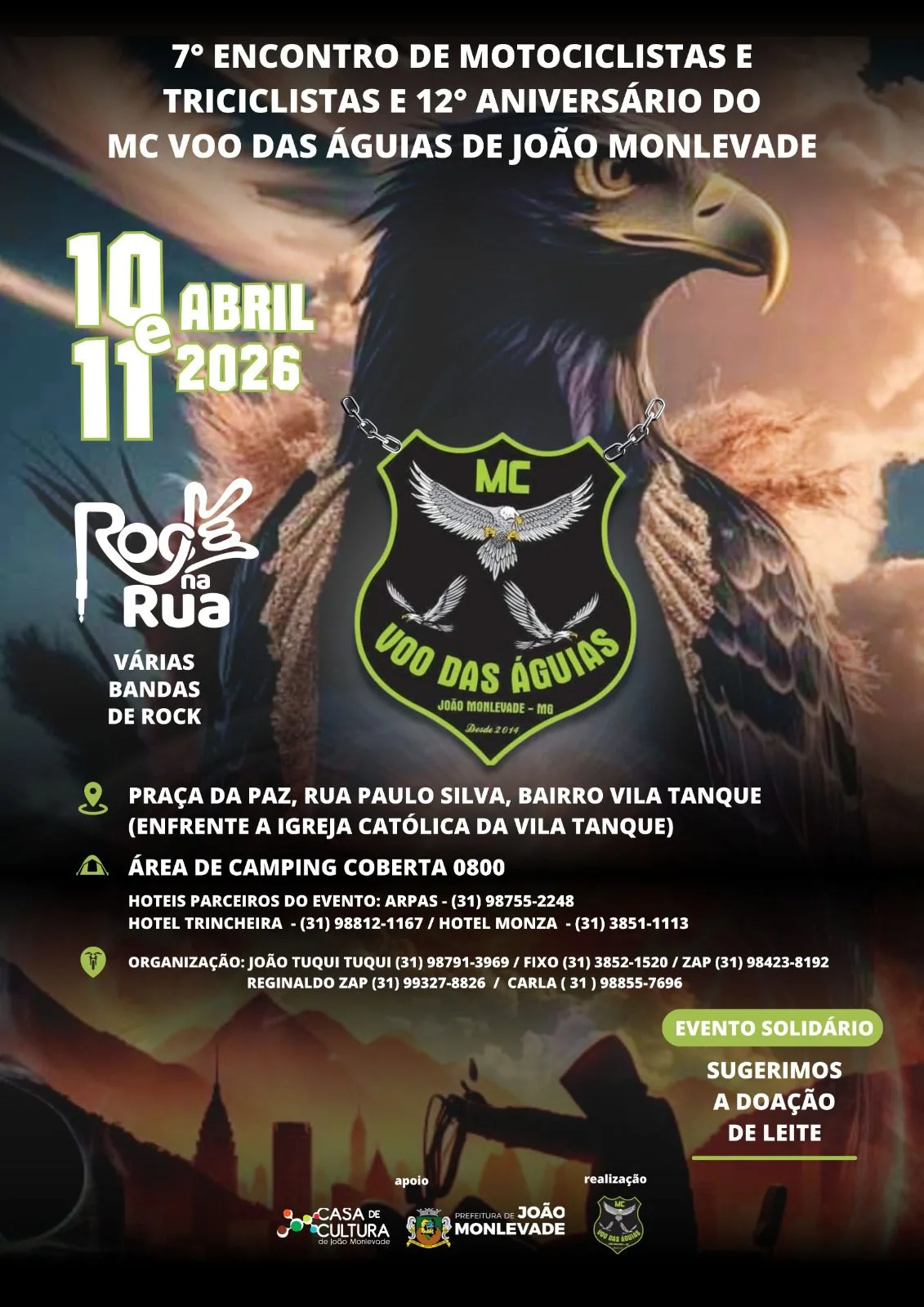 A cidade de João Monlevade/MG convida a todos para uma grande celebração nos dias 10 e 11 de abril de 2026. O evento marca o 7º Encontro de Motociclistas e Triciclistas da cidade e, simultaneamente, comemora o 12º Aniversário do Motoclube Voo das Águias.